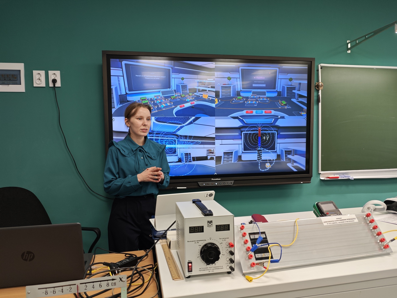 Марина Николаевна Медведева приняла участие в апробации интерактивных материалов, которые могут помочь в понимании самых сложных тем школьного курса физики при подготовке к ОГЭ и ЕГЭ, выполняя задания в трехмерном виде. Так в виртуальной реальности рассматривается одна из сложнейших тем предстоящего девятиклассникам ОГЭ – электромагнетизм. VR-шлем подключается к интерактивной доске и имеет возможность трансляции - один ученик пользуется оборудованием, а остальные видят все, что происходит на большом экране. Педагоги обсудили различные форматы проведения уроков с элементами виртуальной реальности, поскольку занятия могут по-разному организовываться в зависимости от групповой или индивидуальной работы, количества учеников в классе, используемого оборудования.